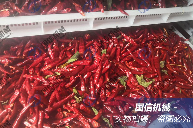 3、二次烘干階段:為保證成品辣椒干貨的品質(zhì),此階段需要辣椒鋪料均勻,堆放不可太厚,保證良好的透氣性,設(shè)置溫度在60~70℃,時長在6~8個小時即可。