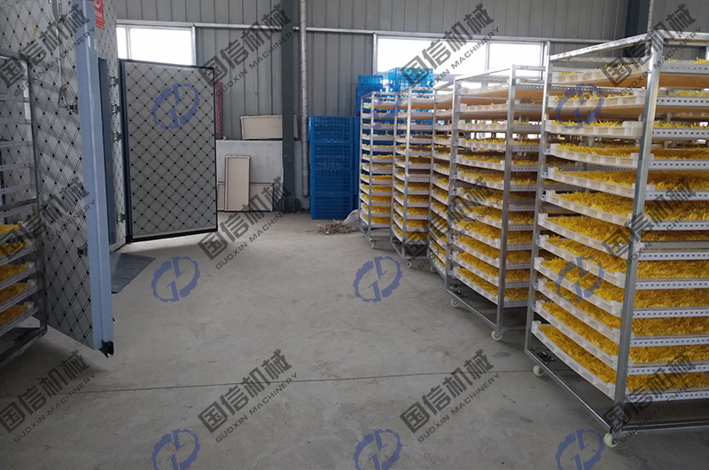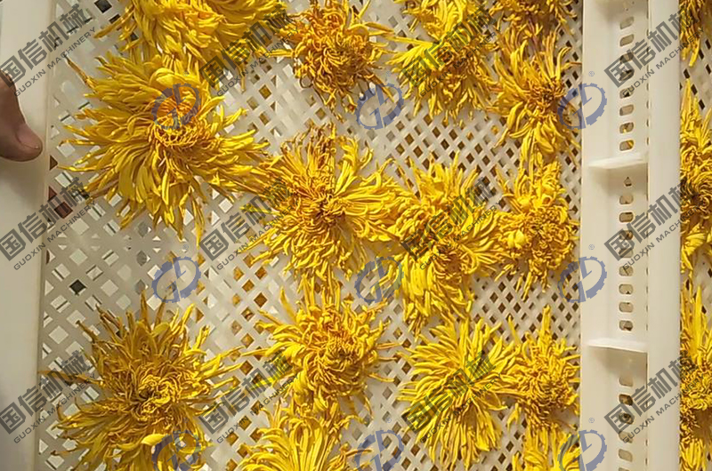 金絲皇菊烘干房采用的是靜態(tài)烘干模式,通過熱源裝置,讓烘干房內(nèi)的溫度升高到制定值,對擺放在房內(nèi)的菊花進行干制。烘干房的智能化控制系統(tǒng),可以對溫度和濕度進行精準控制,以達到金絲皇菊烘干的目的。金絲皇菊烘干機是由熱泵主機,保溫板房、交叉換熱器、循環(huán)風機、排濕系統(tǒng)、排濕風機、控制系統(tǒng)、推車、托盤等部分組成。