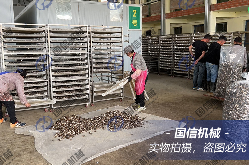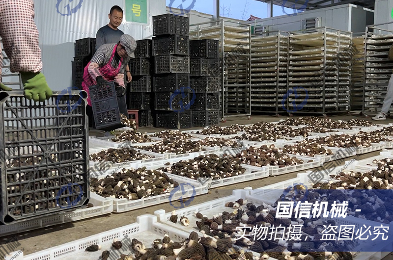 羊肚菌水分含量非常高,在烘干過中要特別注重溫度與濕度的控制。而且不同批次采收的羊肚菌其水分含量不一樣。一般來說,第一茬菇的含水量相對低,陸續(xù)第二茬菇、第三茬菇的含水量一批批加大,都可以在第一茬菇烘干經(jīng)驗的基礎上適當加長時間。這里以第一茬菇的烘干為例,介紹羊肚菌的烘干經(jīng)驗: