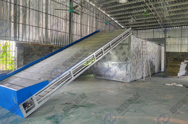 網(wǎng)帶式木瓜絲烘干機(jī)主要由烘干箱體、熱交換爐、輸送裝置、均料裝置、保溫裝置、熱風(fēng)輸入裝置、電控溫控裝置等構(gòu)成。與物料的接觸件為純不銹鋼材質(zhì),全套設(shè)備運(yùn)行可靠,沒有易損件。經(jīng)過處理后的木瓜絲由輸送帶送到頂部上層網(wǎng)帶上,木瓜絲隨網(wǎng)帶呈“S”形從上層往下層移動,熱氣流自下而上穿過網(wǎng)帶及其上的物料層,多層循環(huán)翻轉(zhuǎn),逐層烘干,直至烘干完成,烘干后的木瓜絲從底層的出料口排出。在落料過程中,物料受熱面改變,保證干燥的均勻性。